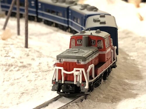今回は機関車を中心にいろいろいじりました。まずはディーゼル機関車にスノープラウをつけました。 当鉄道の設定は東北上信越ですので、耐寒耐雪装備は必須です。ディーゼル機関車群には、いまやレアとなってしまったバンダイ四軸動力を使っていますが、これ…