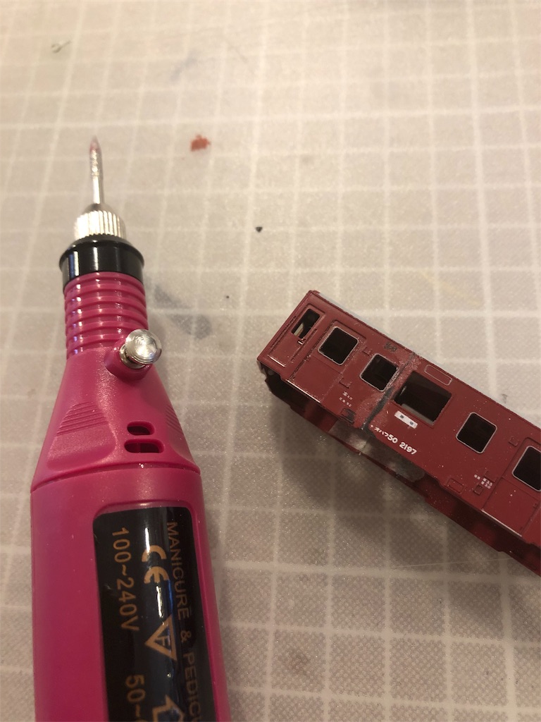 歯医者さんが使う道具のように、盛り上がったパテ部をルーターで削っていきます。なかなかの威力です。ただ、金属のビットだと削りすぎてしまう感じもあります。