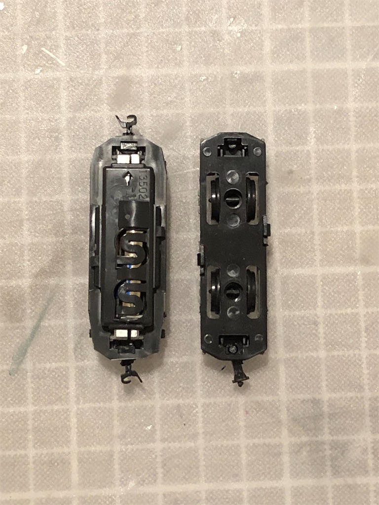 裏側です。動力ユニットは、カプラーが台枠上側の板にハメ込まれる構造ですので、ここを傷つけないように四隅などを切り欠く必要があります。