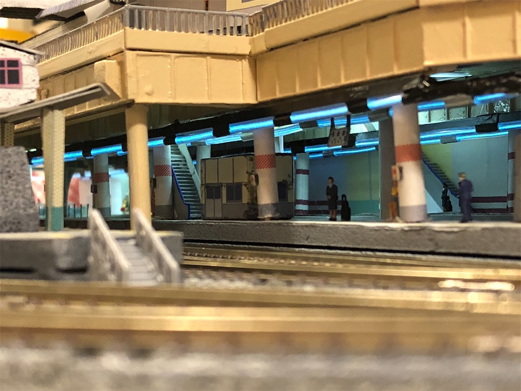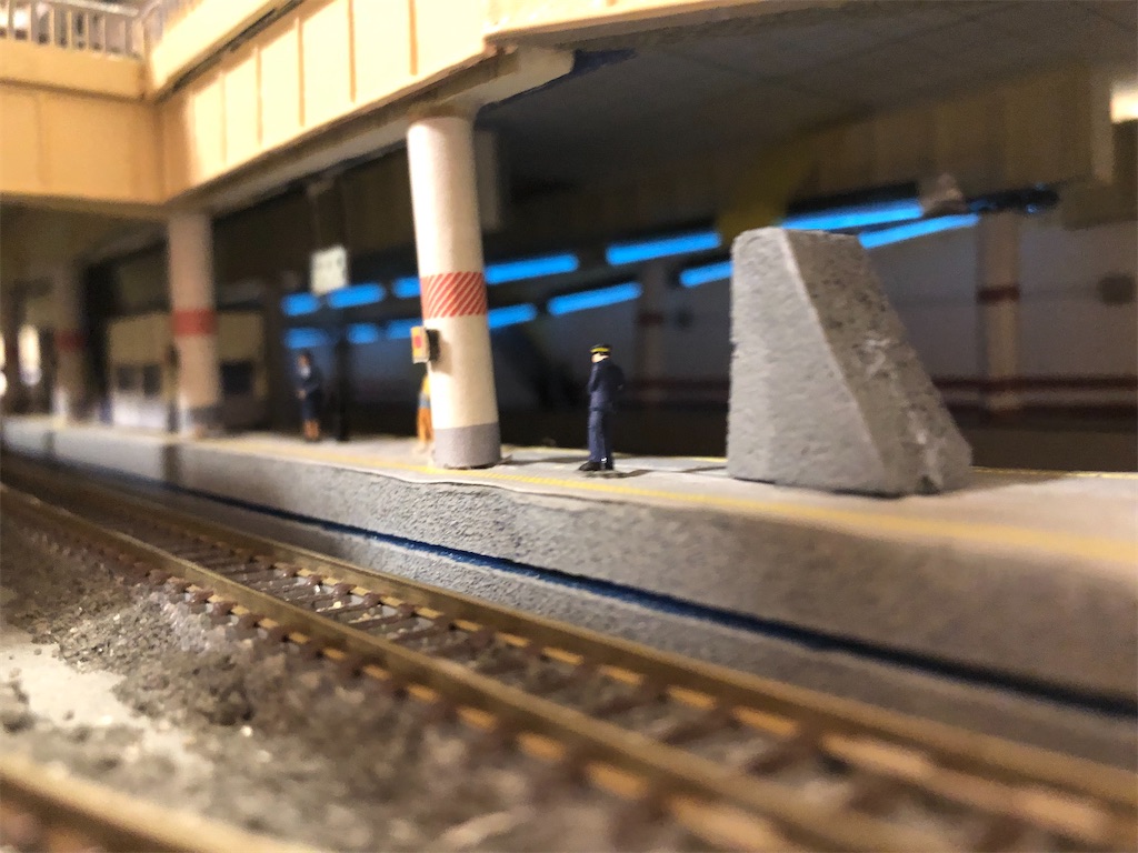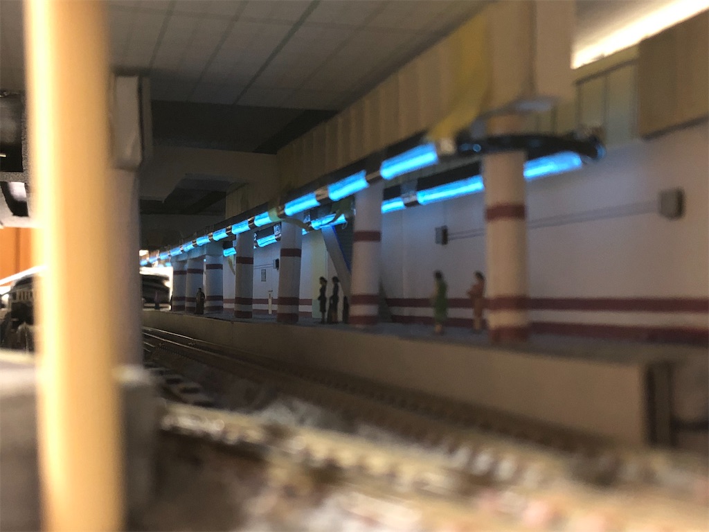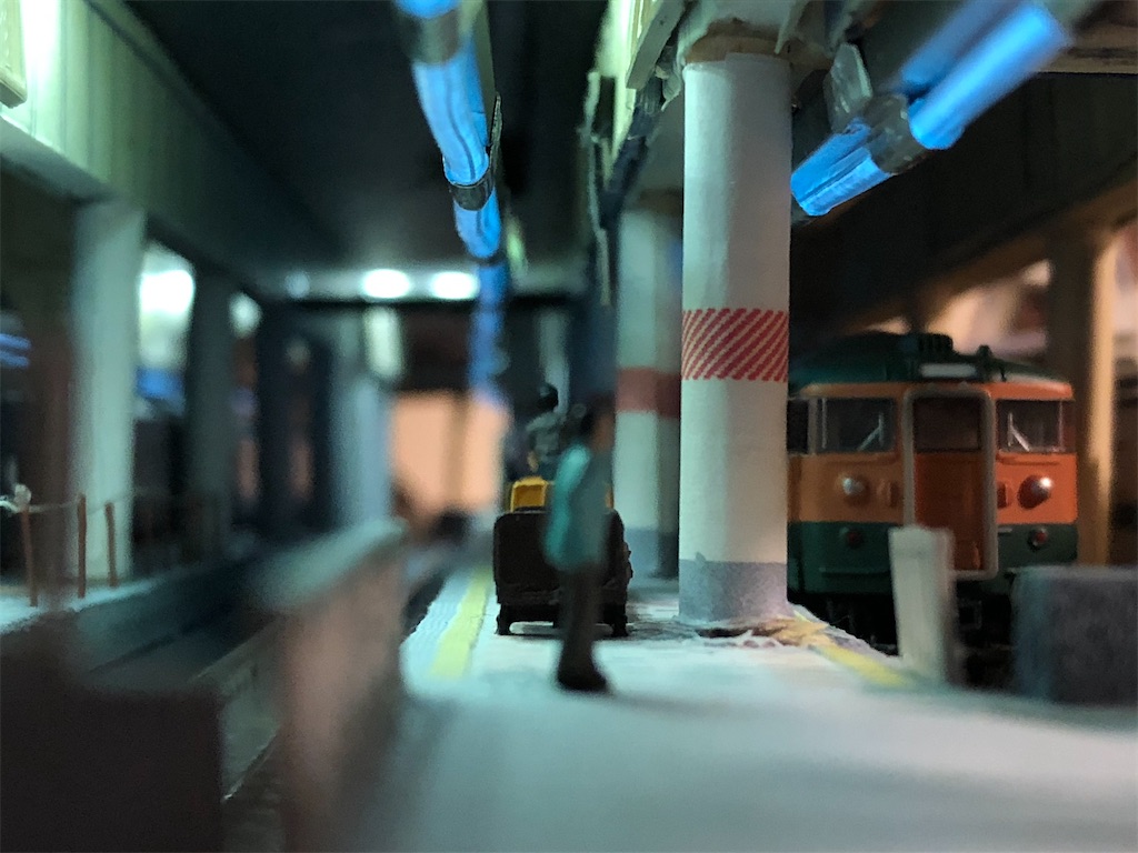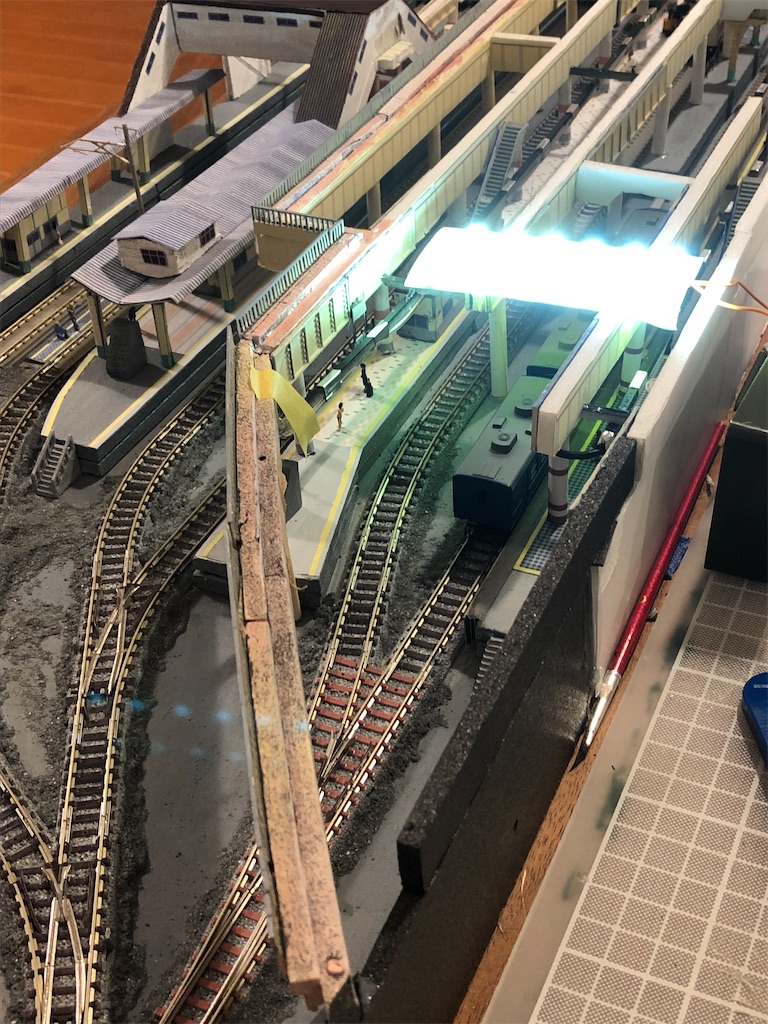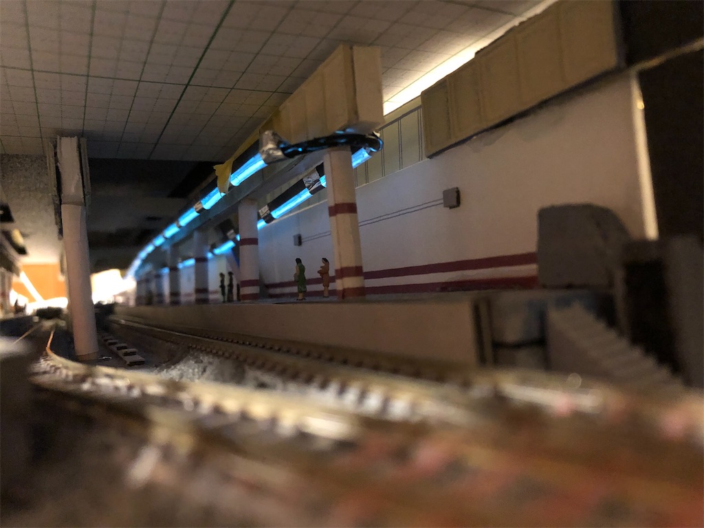 さて、今回の本題です。地平ホームをやるからには、どうしても12番線と15番線の二階建てを表現したくなります。すると、13-15番線は天井の下に隠れて暗くなってしまいます。そこに照明を灯します。