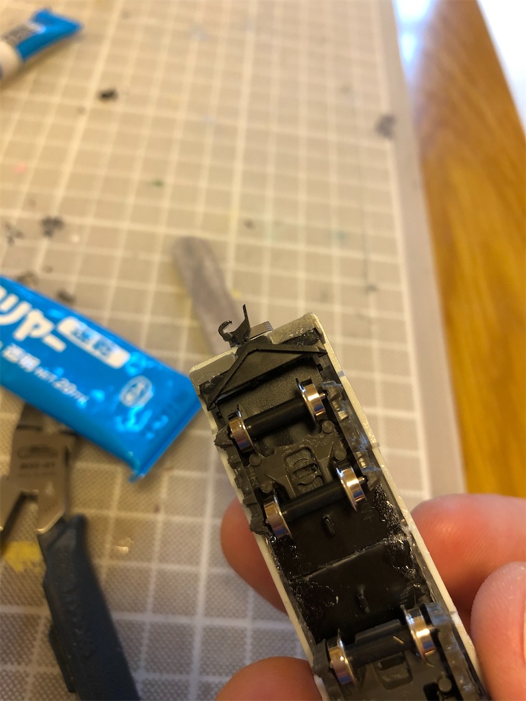 カトーの小型車両用台車から以前切り落としたカプラーポケットには、カトーカプラーのナックルタイプを取り付けました。カトーカプラーの根本の太くなっている所は、バラバラにならない程度にできるだけ小さく削り、首振り範囲を少しでも多くするようにしました。それでも大して首を振らないので、正位置に戻すためのバネは不要な程度となりました。