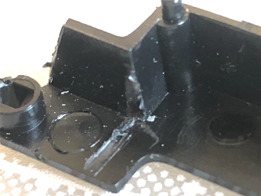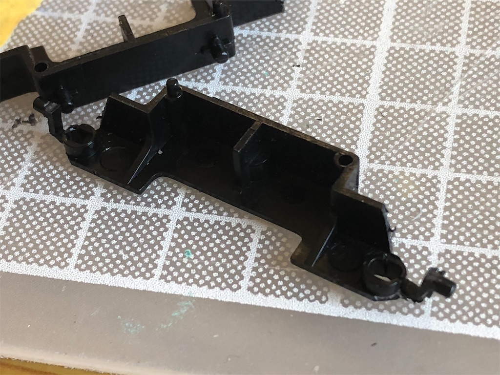 側面パーツの差し込み穴は片側3つずつありますが、真ん中以外の穴の内側を削ることも必要です。ここも微妙に動力が当たります。