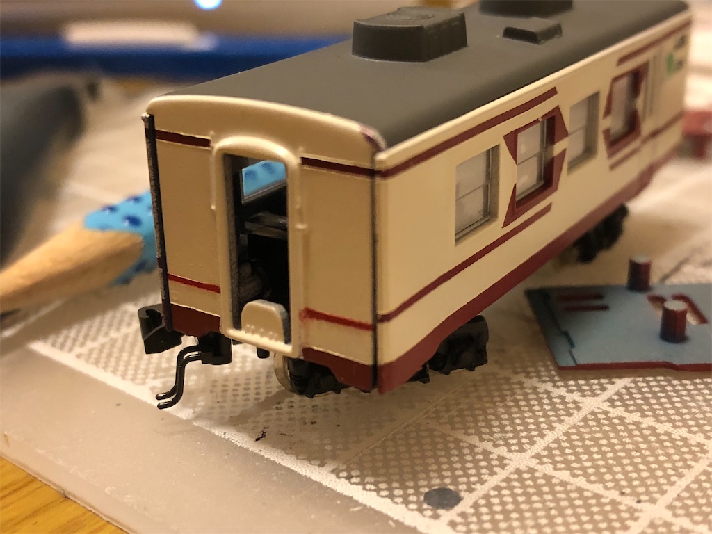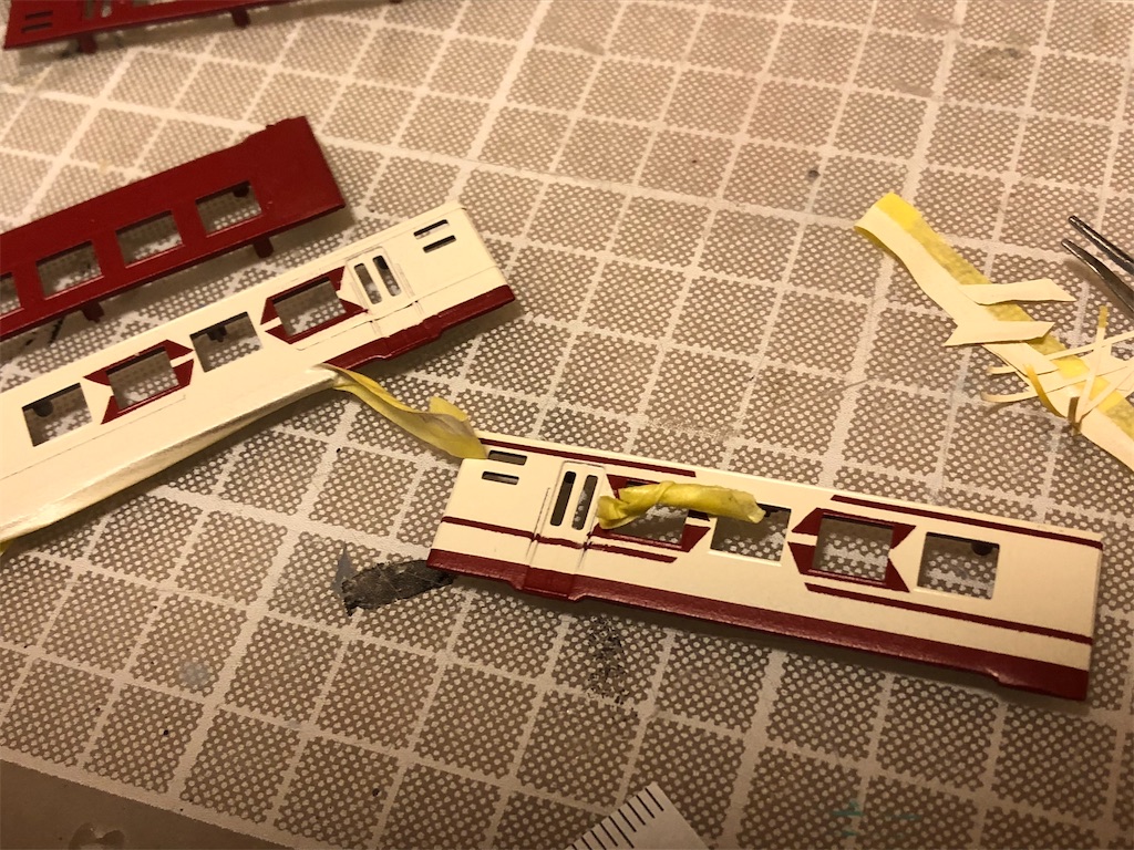 ふれあいみちのくの特徴として、妻面まで回り込んだ塗り分けがあります。窓をはめないと車体を組み立てられないBトレ塗装は、こういう作業が苦手です。別々にマスキングしたところ、案の定ズレました。