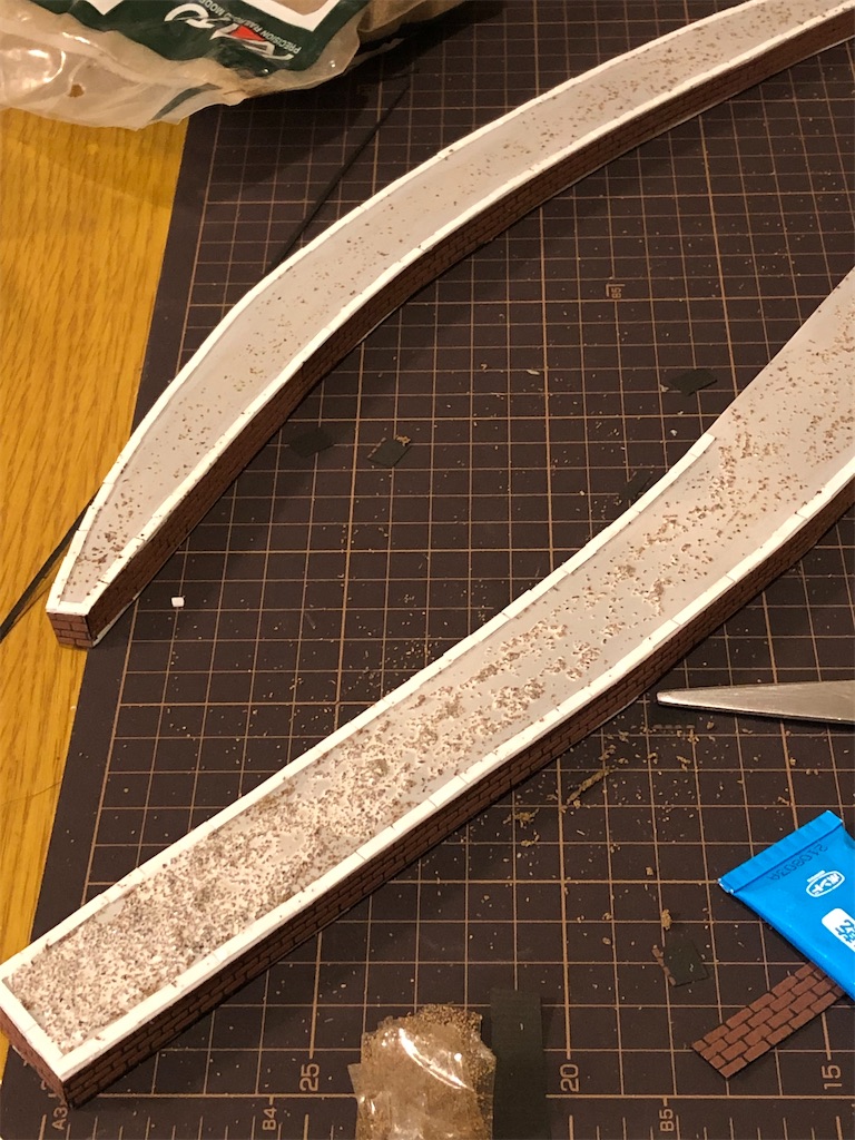 カトーから砂利状の地面がシーナリーペーパーが発売されており、これを貼ればよかったです。結局後からガリガリ削ることになりました。