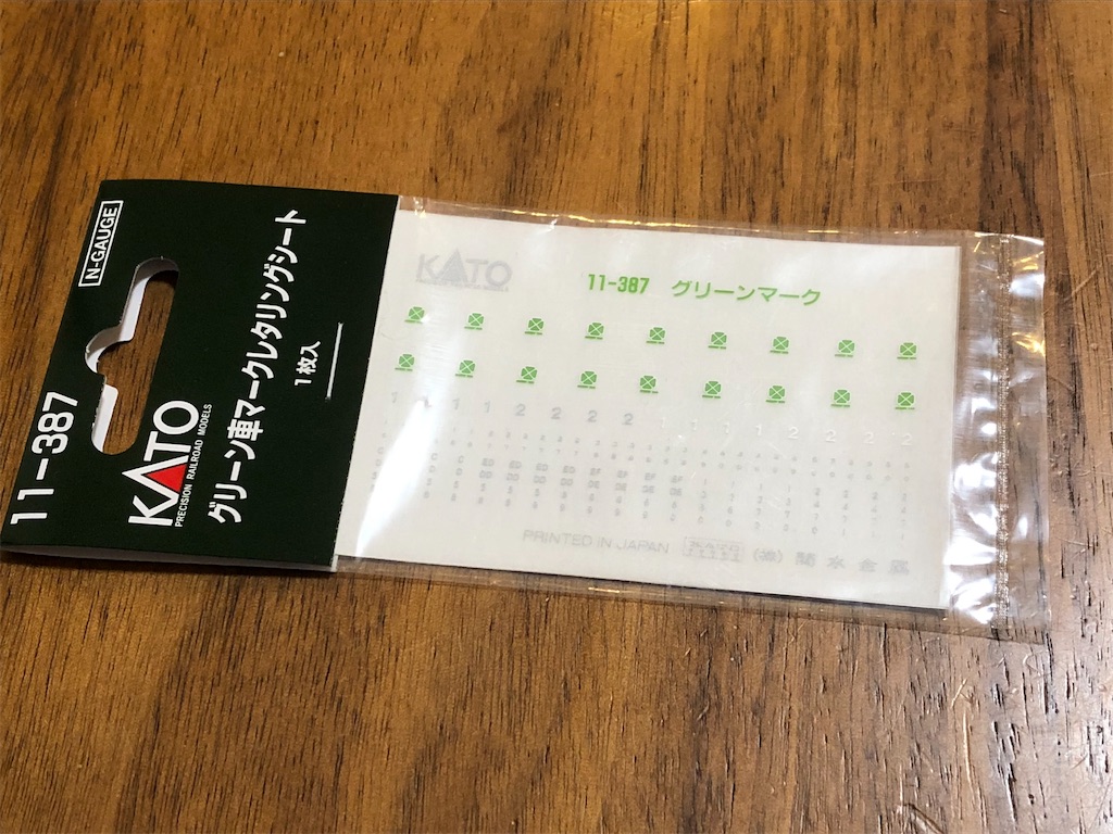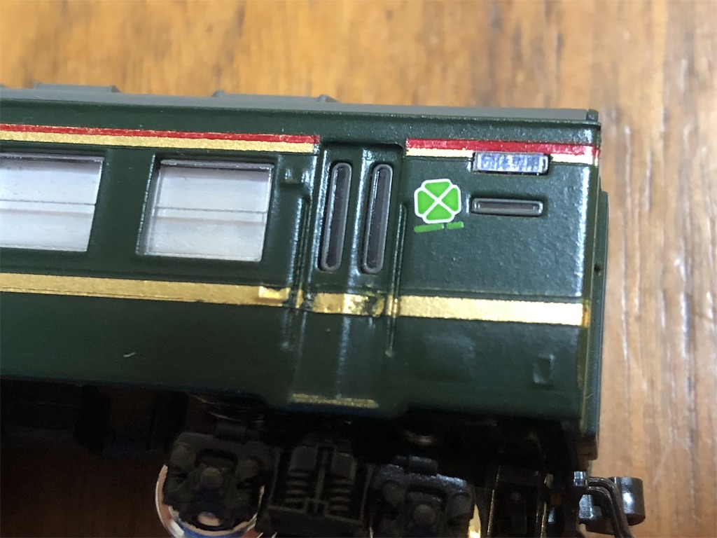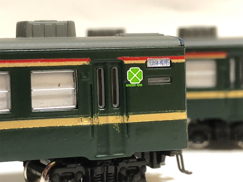 白樺のスロフにはドアが片側2つ残っており、グリーン車マークもたくさん必要です。Bトレステッカーのグリーン車マークも同じ大きさや色味でたくさん揃えるのは難しく、今回は豪華にカトーの製品を使ってみました。
